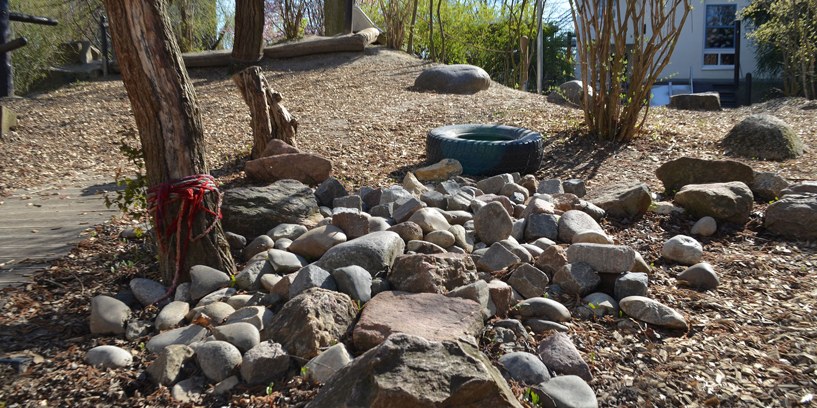 Das naturnahe Außengelände bietet umfangreiche Bewegungsanregungen und bewusstes Erleben der Natur und ihrer Jahreszeiten. Das tägliche Spiel, sowie der sorgsame Umgang mit Pflanzen und Tieren ermöglicht den Kindern authentische und entwicklungsintensive Naturerfahrungen.