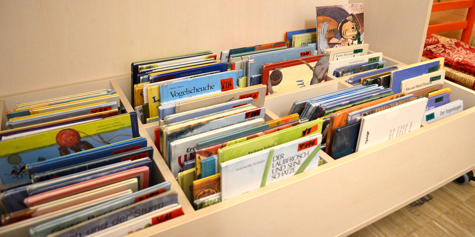 Unser „Haus-der-Großen-Kleinen-Leute“ verfügt über eine eigene kleine Bücherei, die eine Zweigstelle der öffentlichen Bücherei ist und bietet umfangreiche Literatur für die Kinder.